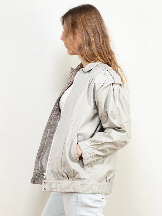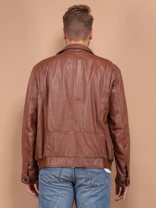 Vintage 90's Men Leather Bomber Jacket in Beige