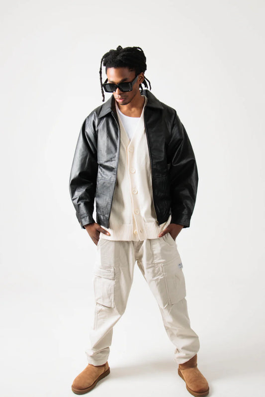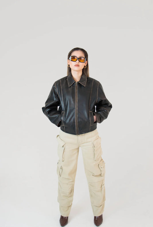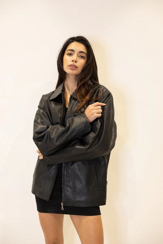 Express yourself in our 90’s inspired oversized leather bomber jacket. A must have staple leather bomber jacket finished in an oversized silhouette that can be worn dressed up or dressed down.
